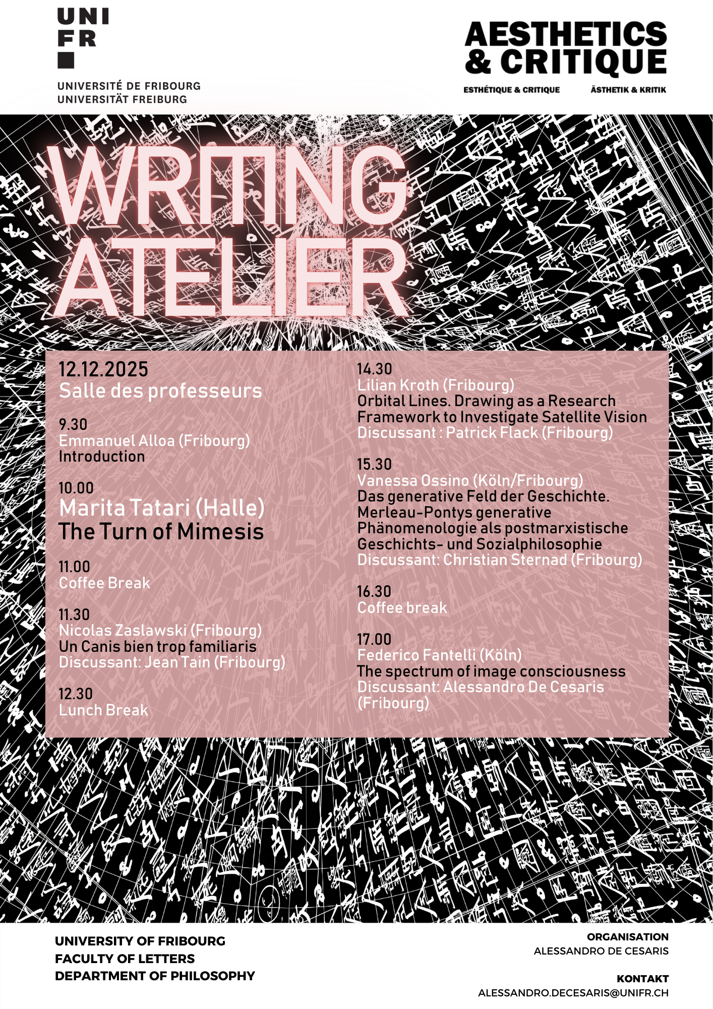 17.02.2026 Jean Tain (Fribourg) Paysages technicisés 24.02.2026 Martin Rueff (Genève) Rousseau et l’art du roman comme technique de la sensibilité 03.03.2026 Christoph Haffter (Basel) Räume des Hörens in der zeitgenössischen Musik 10.03.2026 Daniel Feige (Stuttgart) Horror: Film und Negativität 17.03.2026 David Espinet (Strasbourg) L’image avant l’image 24.03.2026 Béatrice Joyeux-Prunel (Genève) Faire du Dalí sans en … Read more[Seminar Cycle] Techniques of the senses (Spring Semester 2026)